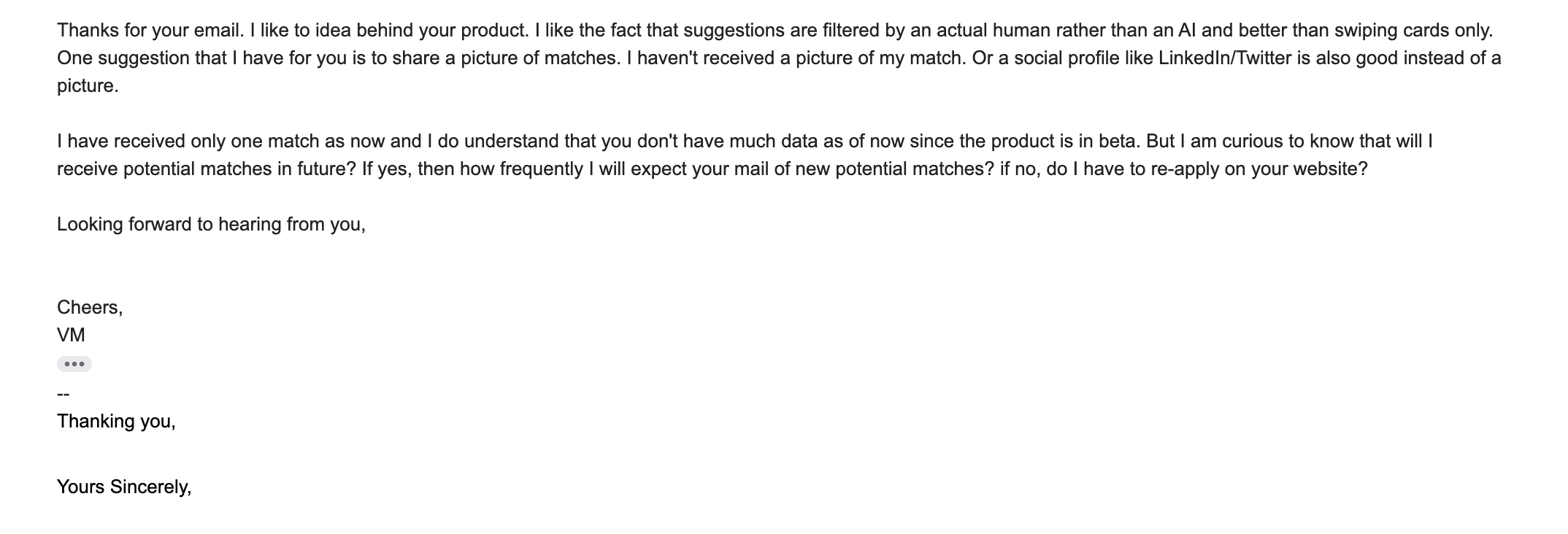 Mình đang xây dựng phần mềm hẹn hò, mai mối. Thay vì bỏ tiền xây dựng ứng dụng, mobile app/website tốn kém, mình cho khách hàng tiềm năng đăng ký vào một cái form. Rồi mình tự đọc profile và matching họ lại với nhau.