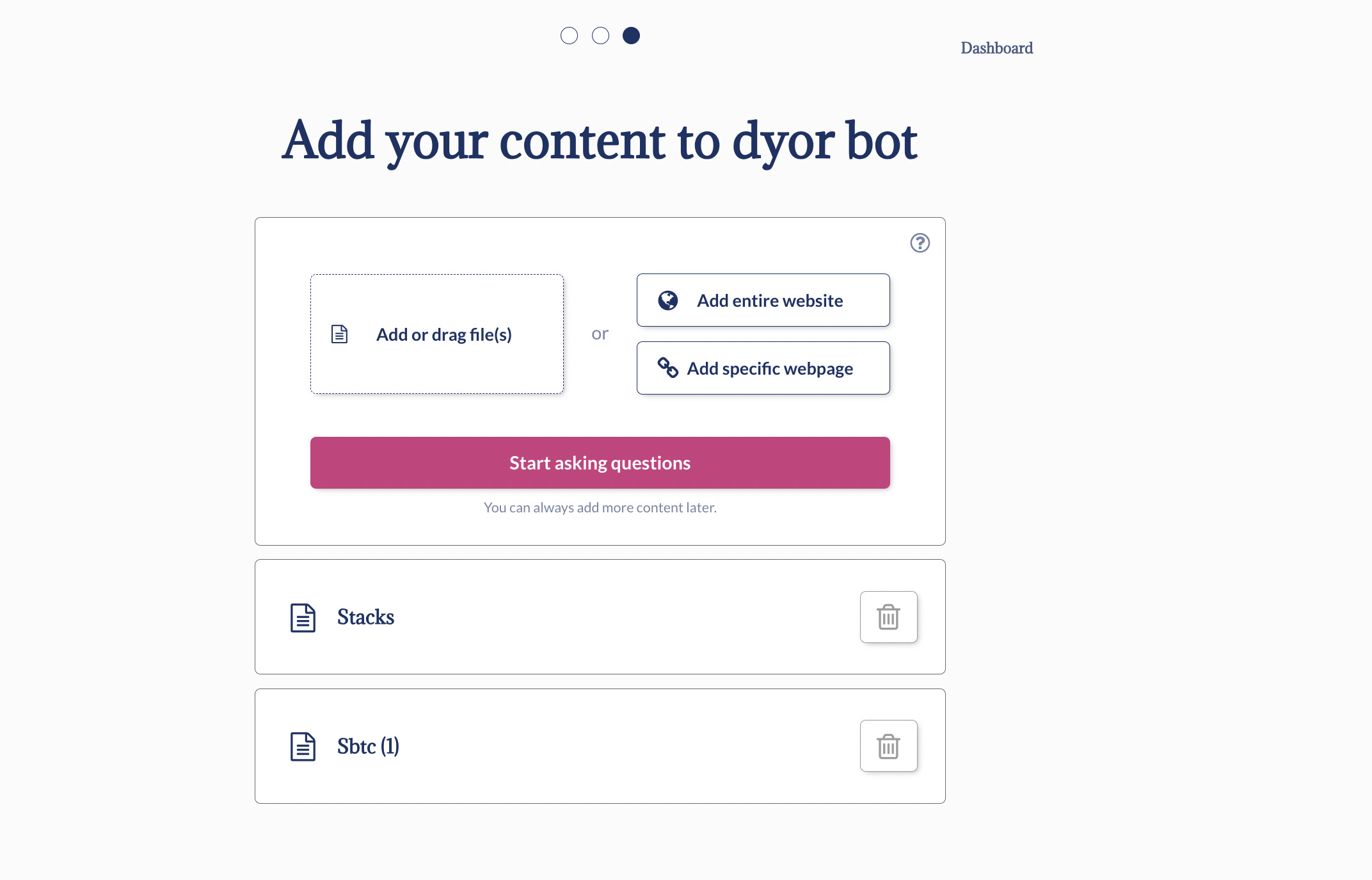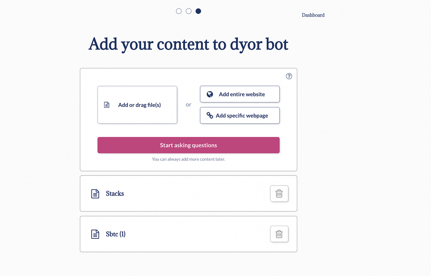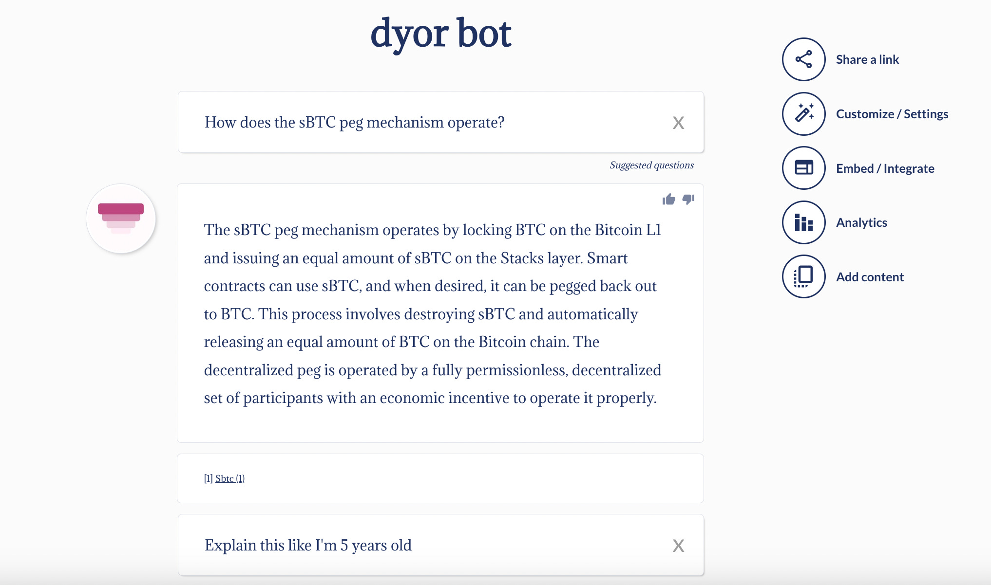 Mình đã làm thử demo: Mình tạo 1 con Bot tên Dyor và upload data là 2 whitepapers của Stacks blockchain. Bạn có thể hỏi và nhờ nó giải thích các khái niệm ở đây