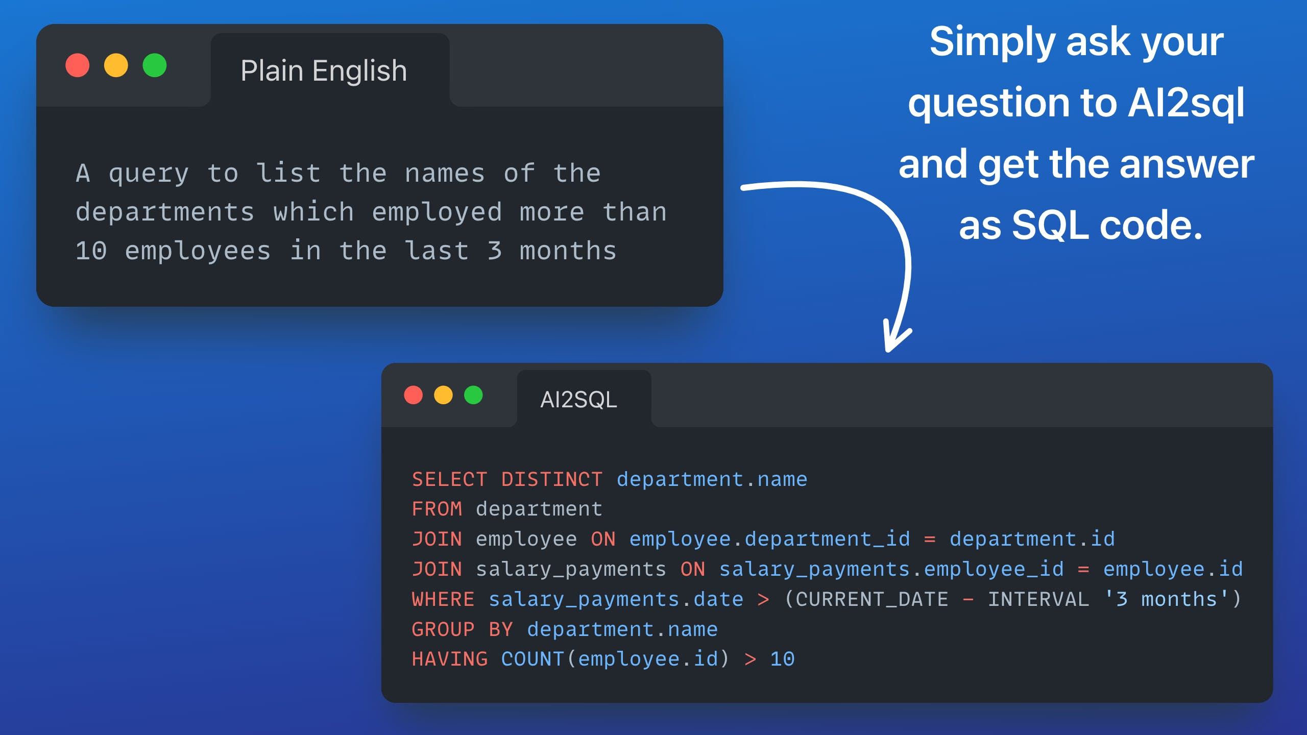 AI2SQL là app hỗ trợ bạn viết câu lệnh SQL. Chỉ cần gõ text, app sẽ chuyển thành câu lệnh SQL cho bạn.