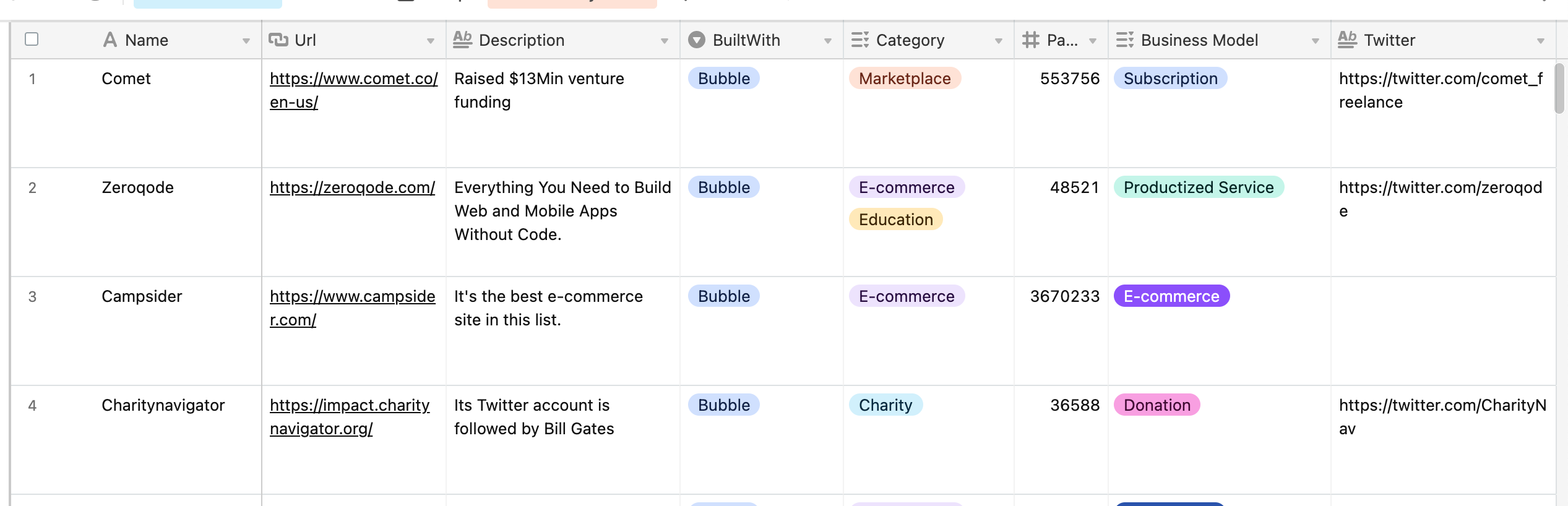 Những dữ liệu mình thu thập: Tên app, url, mô hình kinh doanh, danh mục, built with platform nào (Bubble, Adalo, GlideApps, ShareTribe, vv), Twitter