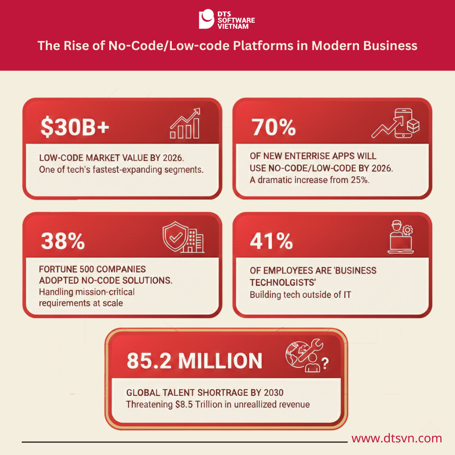 Các báo cáo thị trường cho thấy No-code và Low-code đang trở thành một trong những công nghệ phát triển ứng dụng phổ biến nhất trong doanh nghiệp.