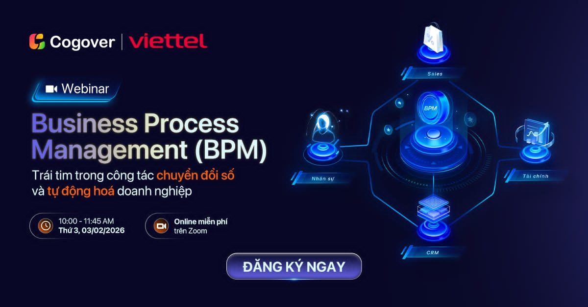 Xuất phát từ những thách thức đó, Cogover phối hợp cùng Viettel tổ chức webinar online miễn phí, nhằm chia sẻ một hướng tiếp cận toàn diện hơn cho doanh nghiệp trong việc tự động hóa và quản trị quy trình. Trọng tâm của chương trình là BPM – nền tảng mô hình hóa quy trình được áp dụng rộng rãi trên thế giới, đóng vai trò “trái tim” trong công tác chuyển đổi số.