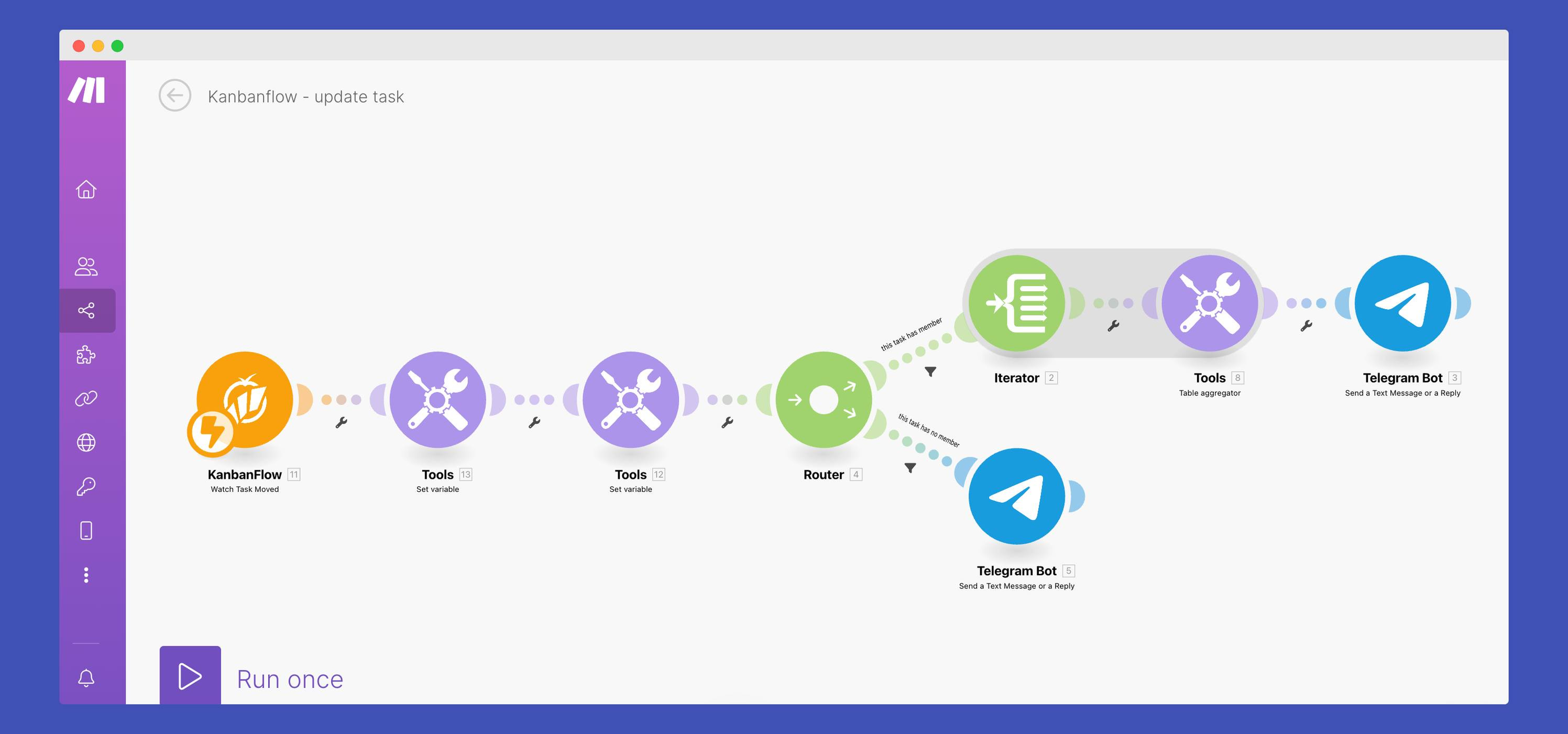 Mình dùng make.com để nhận các sự kiện từ Kanbanflow sau đó bắn tin nhắn tự động sang Telegram.