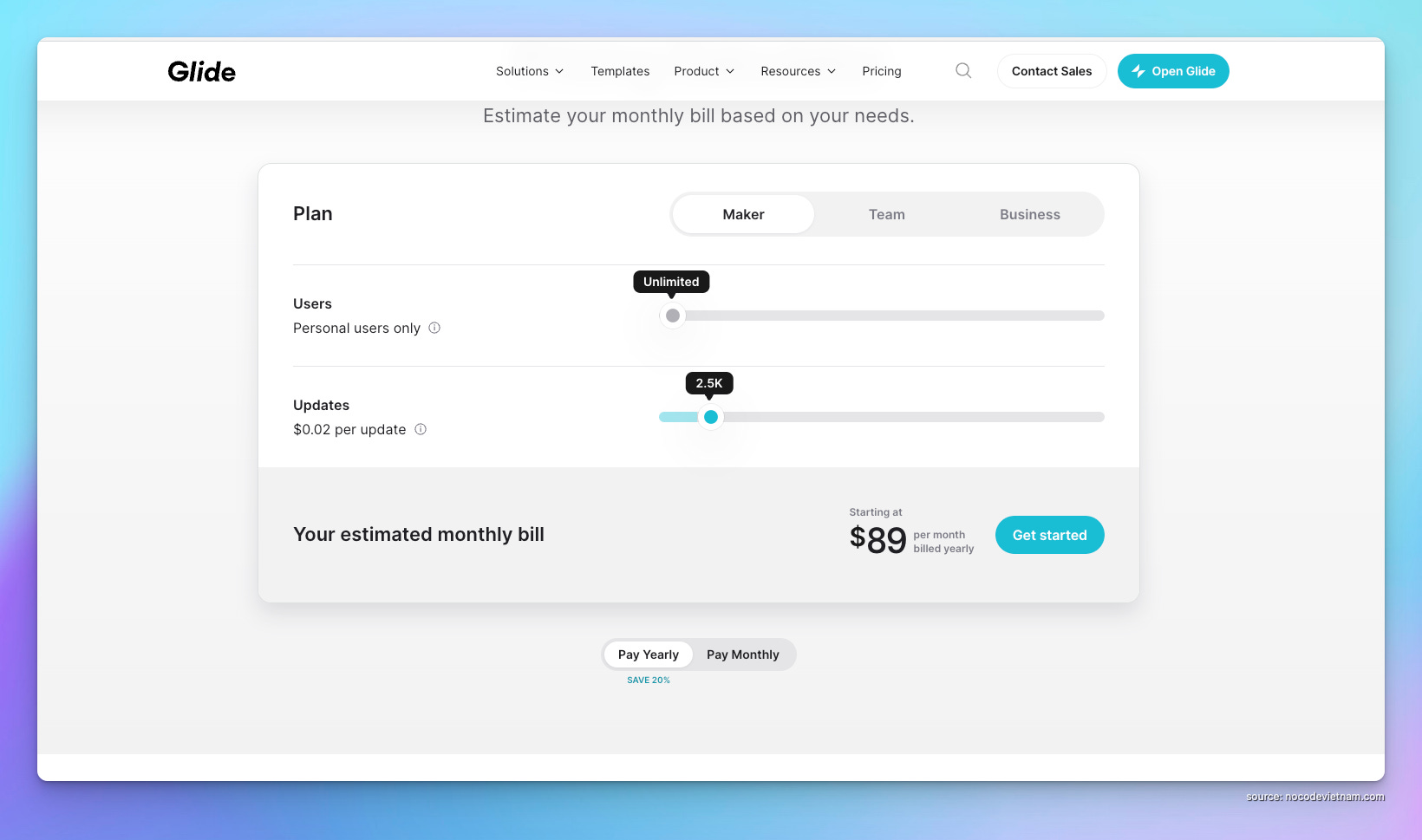 Trong trang pricing, Glide cũng có cái Pricing Calculator cho mọi người tính toán.