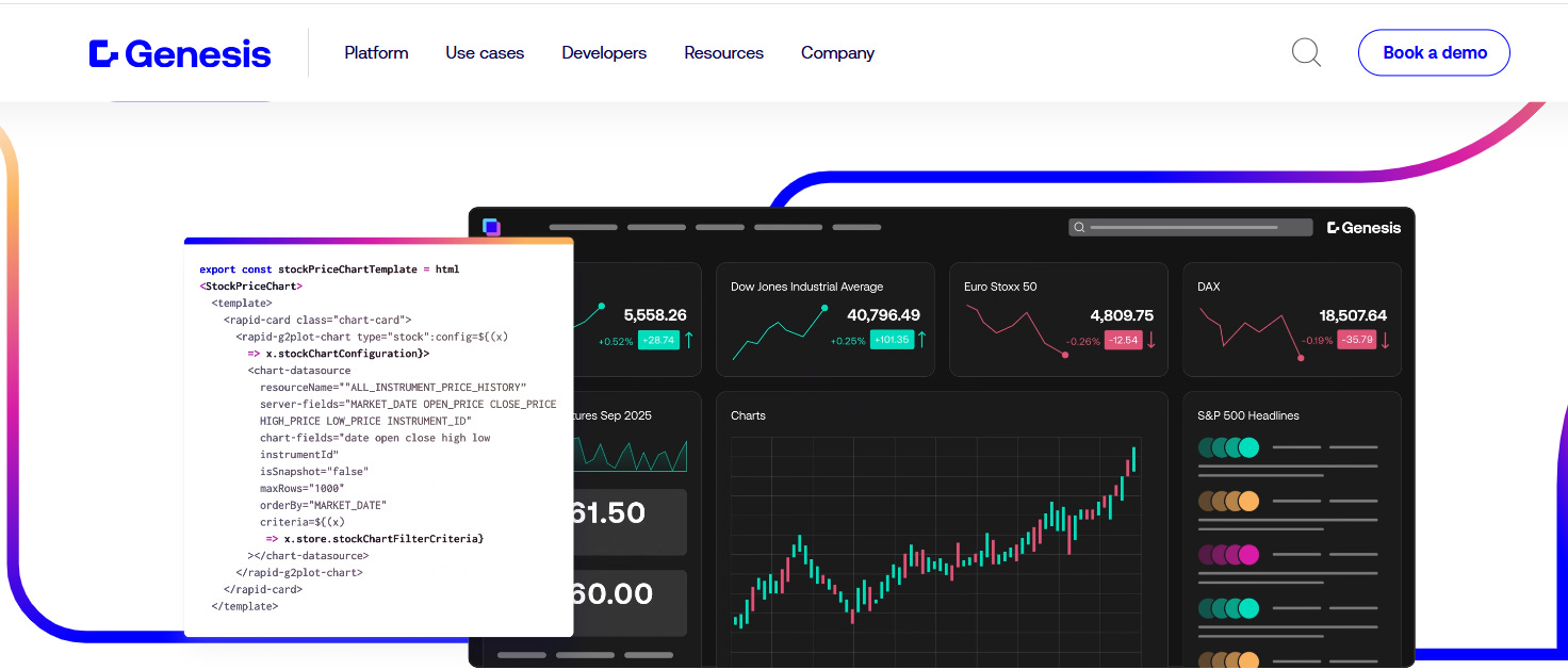 Genesis Global cung cấp giải pháp phát triển ứng dụng tài chính low-code, bao gồm ứng dụng giao dịch, quản lý rủi ro, hệ thống thanh toán và quản lý dữ liệu tài chính.