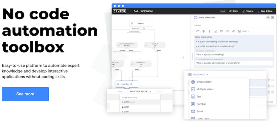 BRYTER giúp tự động hóa quy trình quyết định pháp lý, quản lý tuân thủ, giải pháp HR và tự động hóa dịch vụ khách hàng, thích hợp dành cho các những người không có chuyên môn sâu về lập trình và kỹ thuật