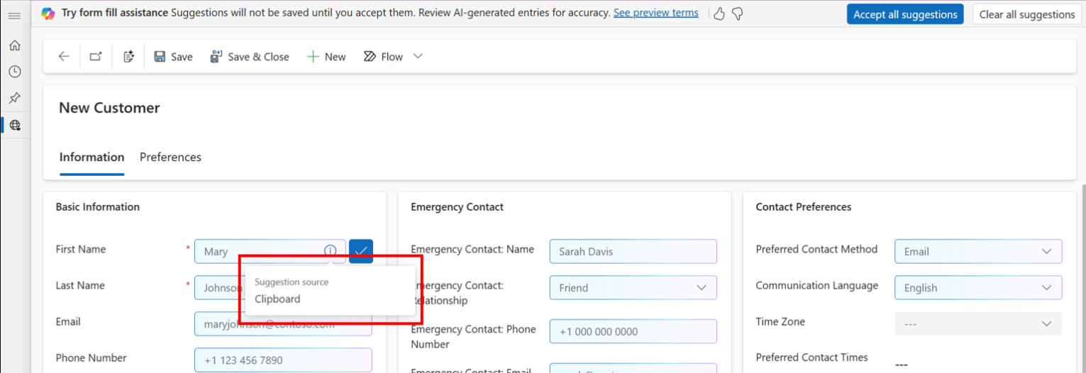Tính năng này yêu cầu thuộc tính “Cho phép hỗ trợ điền biểu mẫu” phải được bật cho cột có hỗ trợ điền biểu mẫu. Khi nhập một bản ghi mới, các trường được bật sẽ được điền các giá trị gợi ý. Nhấp vào biểu tượng thông tin trên một gợi ý sẽ hiển thị nguồn (ví dụ: “Bản ghi bạn đã cập nhật gần đây” hoặc “Bảng tạm”). Mỗi gợi ý phải được xác nhận bằng cách nhấp vào biểu tượng dấu tích màu xanh lam hoặc bằng cách nhấp vào nút “Chấp nhận tất cả gợi ý”.