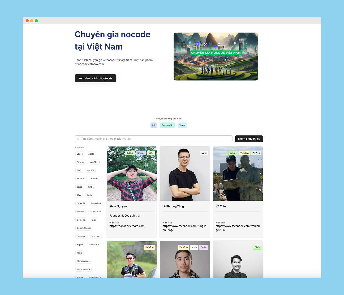 Mình mới làm 1 trang để tổng hợp danh sách chuyên gia NoCode Việt Nam, mọi thông tin của mọi người đều public.