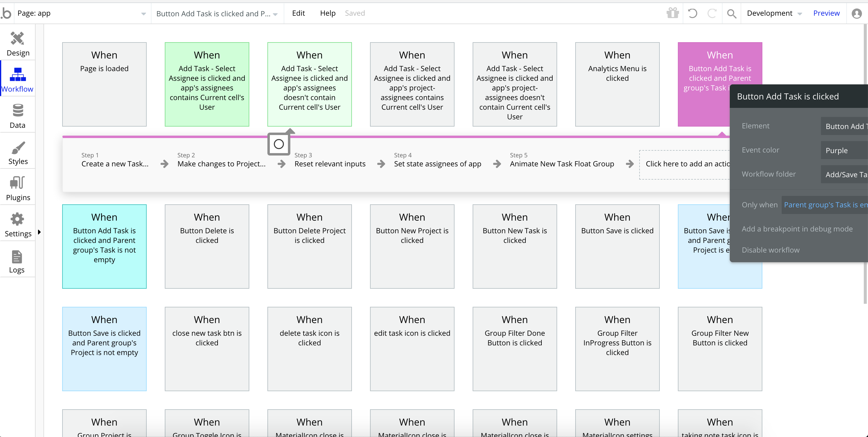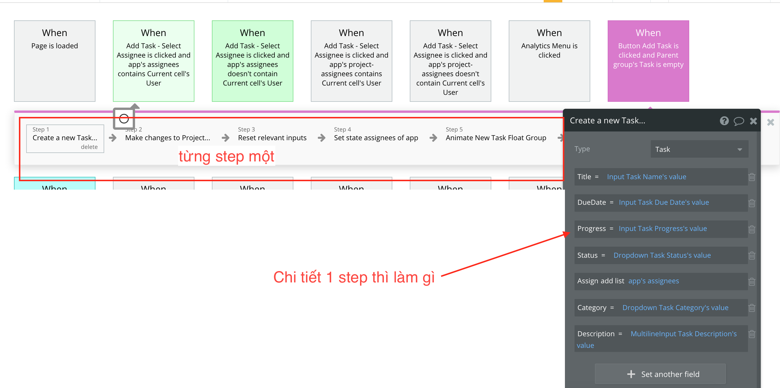 Ví dụ đây là logic của một page trong Bubble. Logic được thể hiện dưới dạng từng khối (block), từng bước (step)