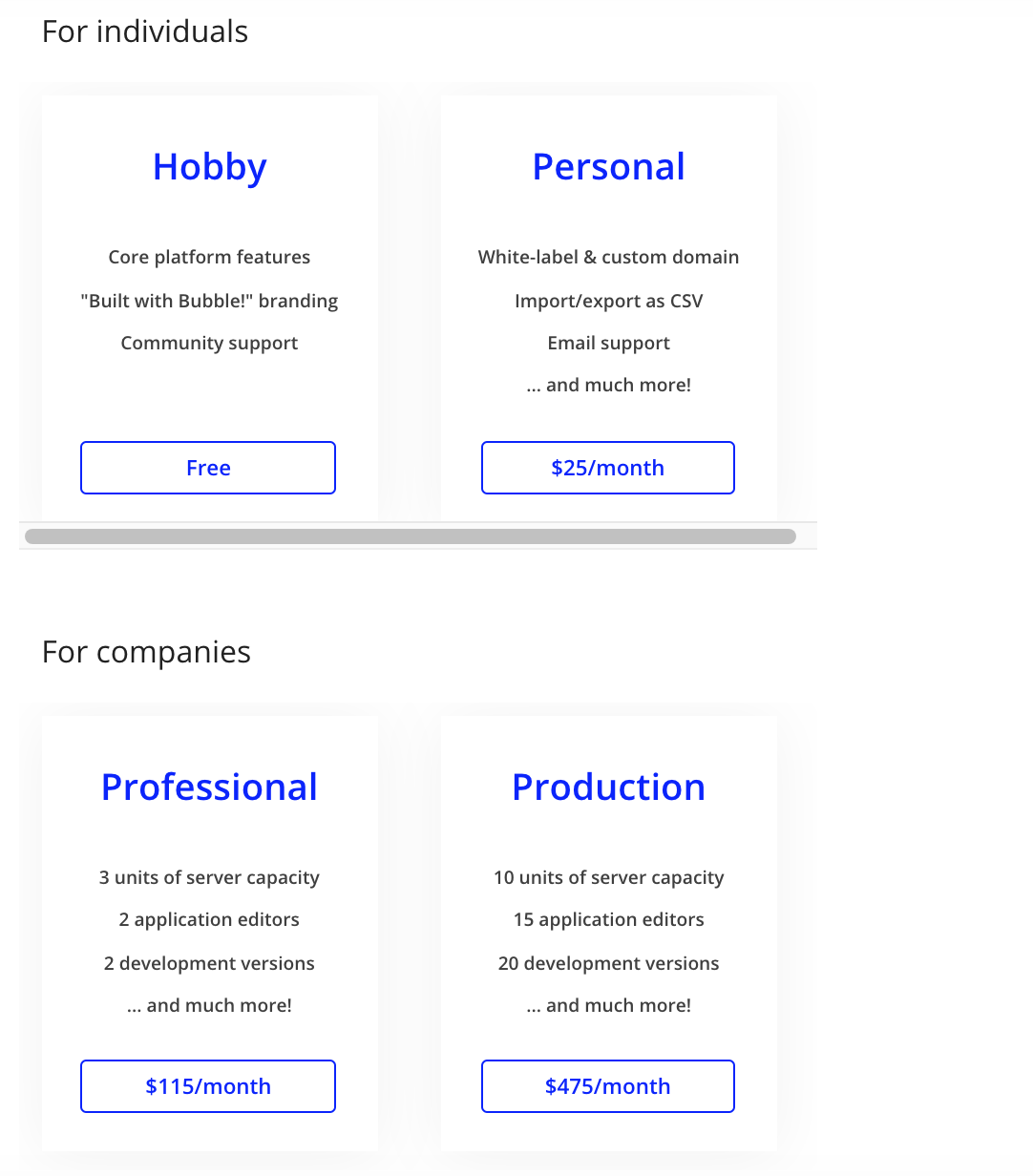 Bubble có gói free để bạn vọc và 3 gói trả phí chỉ từ $25/month.