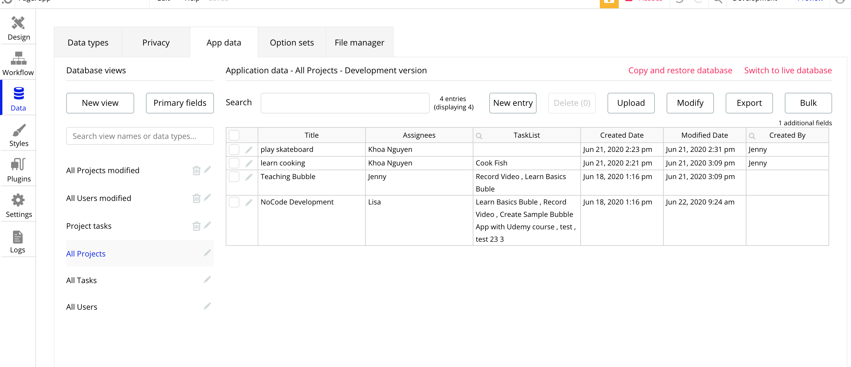 Bạn có thể định nghĩa các bảng, kiểu dữ liệu, định nghĩa relationship giữa các bảng, tạo các role, phân quyền và query dữ liệu ngay trên Bubble