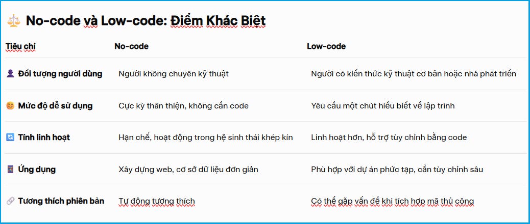 ✅ Điểm nổi bật: No-code loại bỏ rào cản kỹ thuật, giúp người dùng tập trung vào ý tưởng và giao diện, thay vì lo lắng về mã nguồn phía sau.