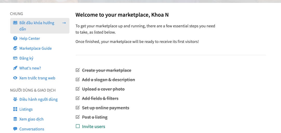 Sau khi đăng ký, Sharetribe có cái user onboard để bạn thiết lập step-by-step các cài đặt thông dụng trước như sau: