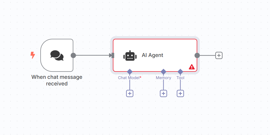 Trong n8n, AI agent được thể hiện dưới dạng một node với một số kết nối mở rộng.