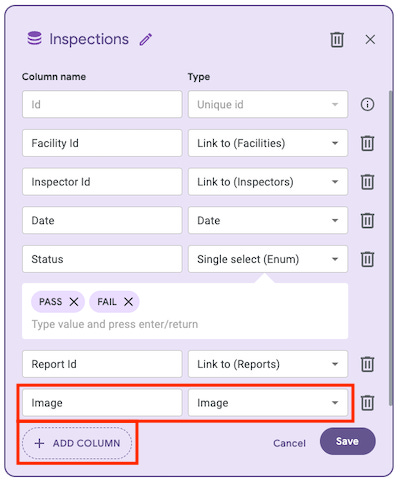 Thêm cột bằng cách nhấp vào + Add column. Nhập tên cột và chọn loại từ menu thả xuống. Nếu bạn chọn Single select hoặc Multi select (Enum), bạn sẽ được yêu cầu thêm một hoặc nhiều giá trị tùy chọn.