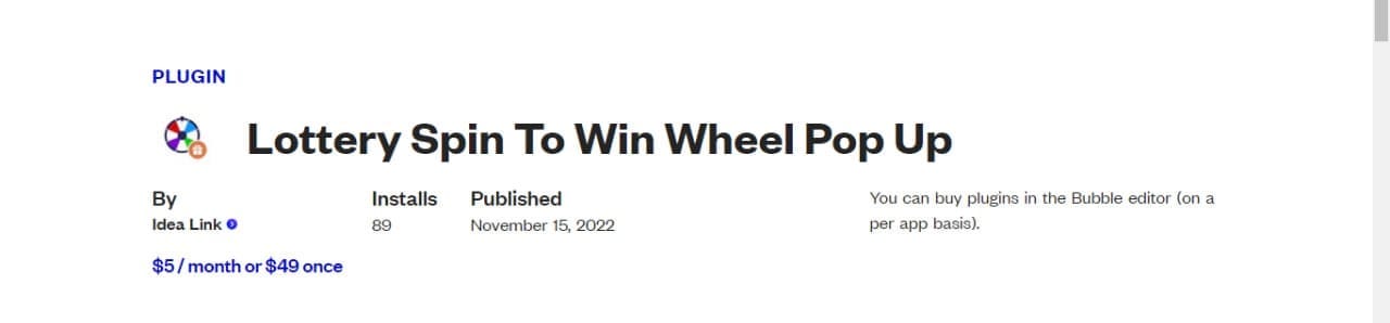 Plugin “Spin To Win Wheel” dành cho Bubble cho phép bạn thêm một vòng quay trúng thưởng tùy chỉnh vào các pop-up. Plugin này có tỷ lệ chuyển đổi cao, lưu kết quả vào cơ sở dữ liệu, cho phép bạn thiết lập tỷ lệ thắng và tùy chỉnh vòng quay với hình ảnh. Đây là lựa chọn hoàn hảo để thu hút người dùng, thu thập email và tăng tỷ lệ chuyển đổi. Plugin dễ dàng cài đặt và có khả năng tùy chỉnh cao. Hãy thử ngay trên ứng dụng Bubble của bạn!